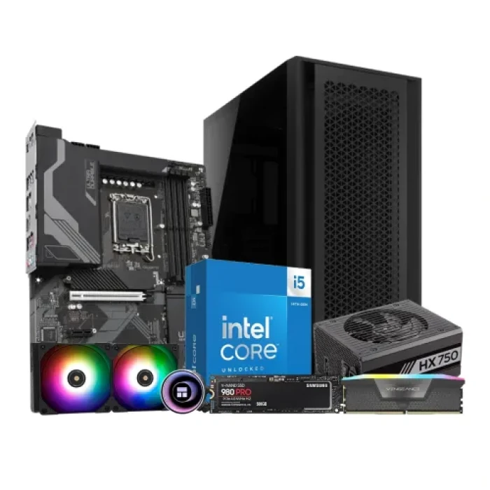 The Intel 14th Gen Core i5-14600K Desktop PC, equipped with the Intel 14th Gen Raptor Lake Core i5 14600K Processor. It also includes the GIGABYTE Z790 UD 14th 13th & 12th Gen ATX Motherboard for optimal performance. The system is further enhanced with the Corsair VENGEANCE RGB 16GB DDR5 6000MHz RAM for smooth multitasking and the Samsung 980 Pro 500GB PCIe 4.0 M.2 NVMe SSD for fast and reliable storage. The Thermalright Frozen Notte 240 ARGB CPU Cooler ensures efficient cooling, while the Corsair HX Series HX750 750W 80+ PLATINUM Full Modular ATX Power Supply provides reliable power. All of these components are housed in the Corsair 4000D AIRFLOW Tempered Glass Mid-Tower ATX Casing for a sleek and stylish design.